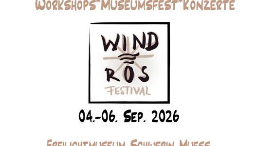 Mitreißende Konzerte, Tanzvergnügen, traditionelle Musik und Folk aus Mecklenburg und ganz Europa und Übersee erklingen auch im September 2026 drei Tage lang am Bauernhaus, im Tanzzelt, Garten und auf der Wiese des Freilichtmuseums Schwerin Muess. Durch die Umbau Maßnahmen im Freilichtmuseum Schwerin-Muess gibt es in diesem Jahr einige Neuerungen im Ablauf und im Programm des Festivals. Im Vorfeld des Festivals wir es erstmals Seminare zur traditionellen Musik am Freitag und Samstag geben mit der Gruppe Viertour, zu denen man sich gesondert anmelden oder die man mit einem speziellen Festival/Seminar Ticket besuchen kann. Infos folgen. Am Samstag findet das Windros-Museumsfest unplugged auf dem Gelände des Freilichtmuseums Schwerin-Muess statt mit Tanzvergnügen im Tanzzelt, mit akustischen Konzerten, Kurzworkshops, Volksliedersingen…uvm. Die traditionellen Windros-Konzerte mit vielen internationalen Bands und Interpreten finden am Freitag und Samstag zwischen 18-23 Uhr auf der Hufe 1 am Bauernhaus und am Armenkaten statt. Es werden wieder Künstlerinnen und Künstler aus ganz Europa und Übersee dort auftreten. Tanzmöglichkeit vor Hauptbühne gibt es auf dem dortigen Tanzboden (8×9 Meter) am Freitag und Samstag 18-23 Uhr Der Tanz am Samstag findet im Tanzzelt des Museums (18×8 Meter) von 10 Uhr bis 18 Uhr statt mit Band aus Deutschland und Europa.