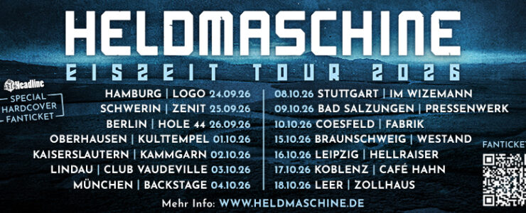 Wegen großer Nachfrage geht die Koblenzer Band 2026 erneut auf Tour! Das letzte Jahr zeigte überwiegend ausverkaufte Clubs. Und die bereits legendäre Heldmaschine-Show mit ihrem unverwechselbar wuchtigen Sound wird nochmals erweitert! Nach erfolgreichen Deutschland- und Europatouren mit Eisbrecher kann HELDMASCHINE es daher kaum erwarten, im Herbst 2026 endlich wieder loszuziehen. Ihre unvergleichlich kraftvolle Live-Energie wird die HELDMASCHINE Eiszeit Tour 2026 zu einem garantiert einmaligen Erlebnis machen. Mit der aktuellen Show beweisen HELDMASCHINE erneut, eine der besten Livebands des Landes zu sein. Freut euch auf ganz große Momente mit HELDMASCHINE!