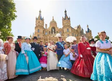 Beim Schlossfest erwacht das Schweriner Schloss zu neuem Leben: Mitglieder des Vereins der Freunde des Schlosses flanieren in prächtigen historischen Kostümen durch Schloss und Burggarten. Mit spannenden Aktionen und vergnüglichen Spielszenen lassen sie das glanzvolle Hofleben der großherzoglichen Residenz aus der Mitte des 19. Jahrhunderts lebendig werden – ein Fest für Augen, Ohren und Fantasie.