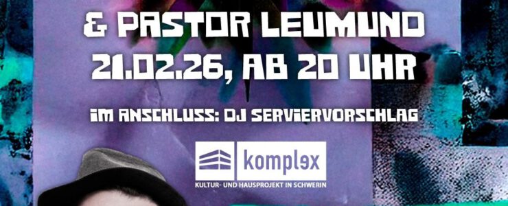 Support gibt es von PASTOR LEUMUND. Seit der Steinzeit sammelt er Durchhalteparolen für Durchgeknallte. Zu den psychedelischen Hiphop- und Elektro-Tracks von Friedrich Greiling aka Mittekill sind daraus nun Diskurs-Disco-Hymnen entstanden, mit denen sich nicht nur Schmunzelraverinnen und Hasskappenhäkler agitieren lassen. Dieses Feuerwerk der knallbunten Schwarzmalerei kann man sich nicht nebenbei anhören. In diesem Sinne: Kommet und staunet!